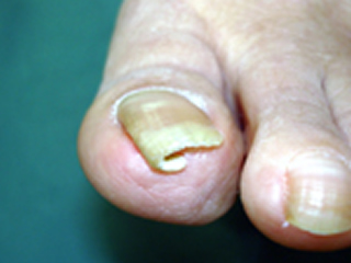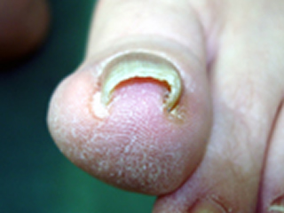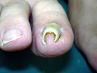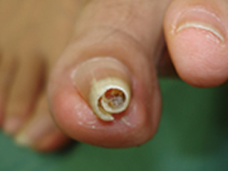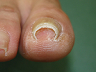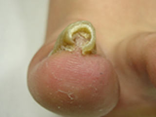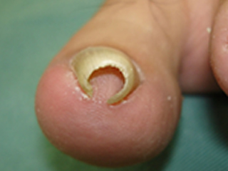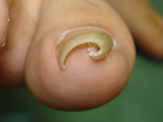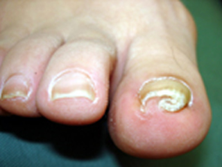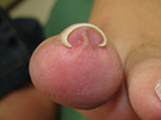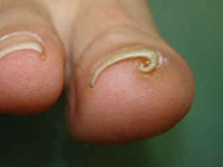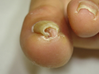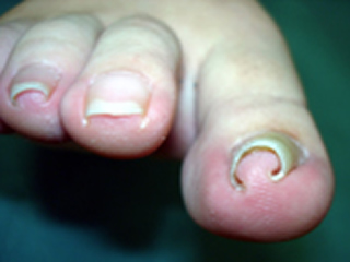 爪の両端が先端部で強く内方に湾曲しそのために爪床(爪下の皮膚)を挟み、皮膚に食い込むことにより強い痛みを引き起こします。この痛みを取り除くために爪を深く切り込めば一時的に痛みから解放されますが、爪が伸びるにつれて爪の巻き込みはより一層強く、痛くなり、切る。の繰り返しで悪循環を引き起こします。